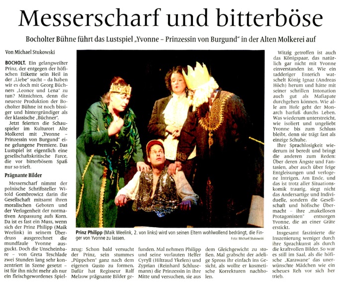 Es spielen: Greta Teschlade, Maik Weelink, Birgit Wiemann, Andreas Höch, Helene Krüger, Hiltraud Ykelen, Reinhard Schlusemann, Petra Ebbert, Conny Meckelholt, Martin Pape, Larissa Top, Michael Seidel, Ralf Ruhle,